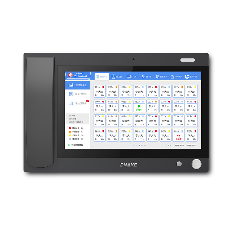 設(shè)置在護(hù)士站,可壁掛也可直接放在桌面上。主要接聽(tīng)病區(qū)內(nèi)病床分機(jī)的呼叫以及患者信息查詢(xún)、廣播等基礎(chǔ)應(yīng)用功能,減輕醫(yī)護(hù)人員來(lái)回跑動(dòng)的無(wú)效勞動(dòng)和壓力,及時(shí)響應(yīng)患者需求,并做好醫(yī)護(hù)信息管理。