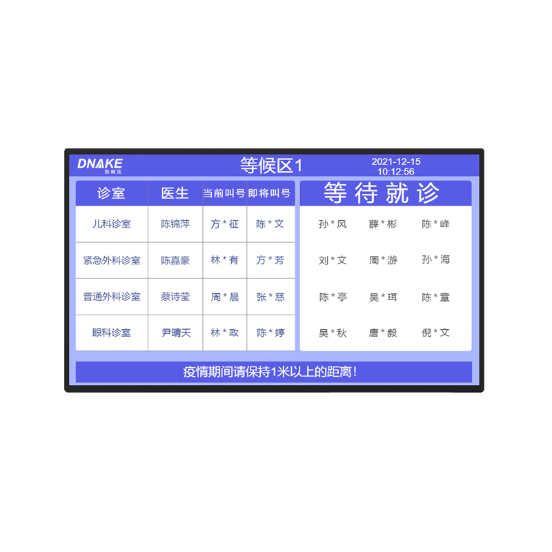 安裝在門診等候大廳,用于隨時得知患者等候科室的叫號順序,便于患者提前準備前往科室,緩解患者在等候過程中的焦慮情緒。